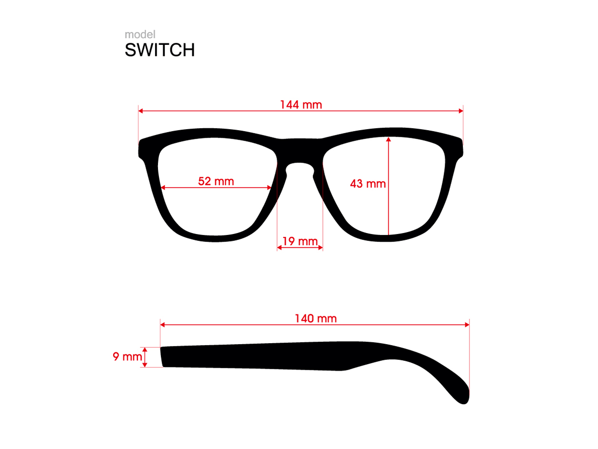 [SWITCH] テンプル部の取り外しが可能で、同モデル同士で、自分の好みの色にテンプルフレームを交換可能。フレーム・サイズは ORIGINAL モデルをベースに、厚み全体を全体的にやや薄くする等して、軽量化をしている。